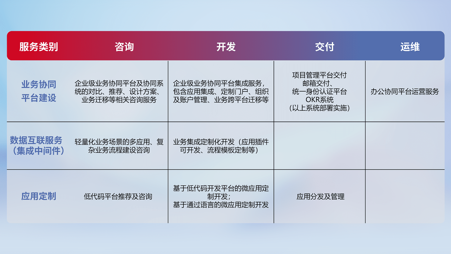 针对钉钉、、企微、、、、IDaas等平台级产品提供产品的规划、、方案、、、、交付、、、、定制化开发等服务,,实现如统一协同办公、、智能客户服务、、、、混合会议管理、、、智能数据查询、、、、等业务场景,,,,实现数字化转型。。。。